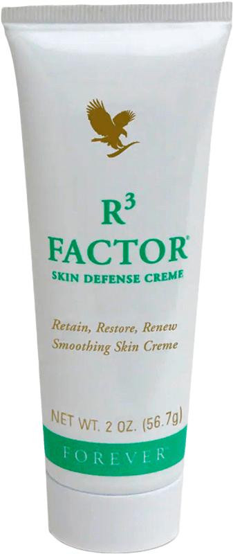 Pomozite vašoj koži u očuvanju prirodne vlažnosti, održavanju njene otpornosti i obnavljanju njenog izgleda sa R3 Factor Skin Defense Creme — bogatom kombinacijom stabilizovanog gela aloe vere, topljivog kolagena i a-hidroksi-kiselina, osnaženim vitaminima A i E, nužnim u očuvanju zdrave kože. Vitamin E je snažan antioksidans, dok vitamin A pomaže u očuvanju zdrave kože i delotvoran je u lečenju mnogih problematičnih stanja kože. Alfa -hidroksi-kiseline (AHAs) koje dobijamo iz prirodnih biljnih izvora, drugačije se nazivaju i voćnim kiselinama. Glikolna kiselina se dobija od šećerne trske, limunska kiselina od agruma, vinska kiselina od grožđa, a jabučnu kiselinu nalazimo u jabukama. Zajedno, ove voćne kiseline čine eksfolijante koji uklanjaju mrtve ćelije s površine kože otapajući prirodne lepljive materije koje onemogućavaju uklanjanje mrtvih ćelija. Te ćelije čine prepreku kremama koje vlaže kožu pa njihovim uklanjanjem dolazimo do mladih ćelija koje doprinose sjaju i svetlijoj boji kože. Budući da je potrebno 21-28 dana za celokupan proces obnove kože, potpuno delovanje R3 Factora biće vidljivo tek nakon tog vremenskog razdoblja. Kreme na bazi voćnih kiselina smatraju se danas najbitnijim agensima za negu kože. Kombinovanjem AHA-kiselina s umirujućim delovanjem aloje, pruža prvu liniju zaštite u borbi protiv štetnog uticaja vremena i u očuvanju mladolikog izgleda kože.